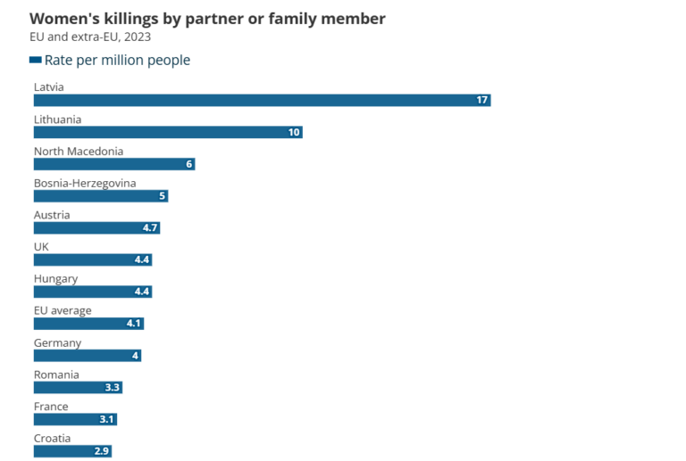 Просекот во Европската Унија изнесува 4,1 убиена жена на еден милион жители, што е значително помалку од стапката регистрирана во Македонија. Според Евростат, жените во ЕУ се убиени речиси двојно почесто од мажите кога сторителот е партнер или член на семејството.