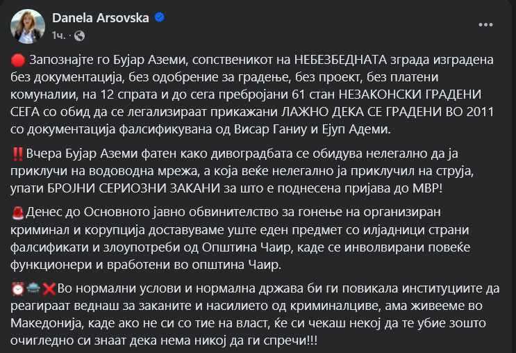 Градоначалничката Данела Арсовска денес на Фејсбук сподели фотографии и информации за, како што вели таа, сопственикот на небезбедната и нелегална 12-катница во Чаир.