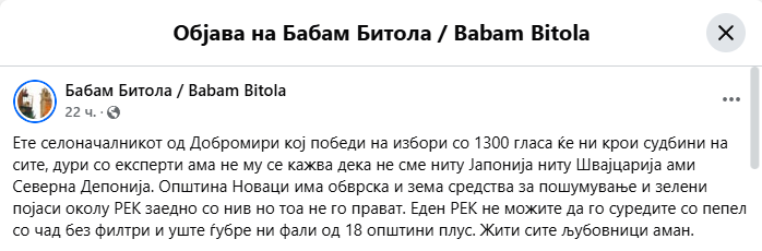 – Ете селоначалникот од Добромири кој победи на избори со 1300 гласа ќе ни крои судбини на сите, дури со експерти ама не му се кажва дека не сме ниту Јапонија ниту Швајцарија ами Северна Депонија. Општина Новаци има обврска и зема средства за пошумување и зелени појаси околу РЕК заедно со нив но тоа не го прават. Еден РЕК не можите да го суредите со пепел со чад без филтри и уште ѓубре ни фали од 18 општини плус. Жити сите љубовници аман. – напишаа од „Бабам Битола“.