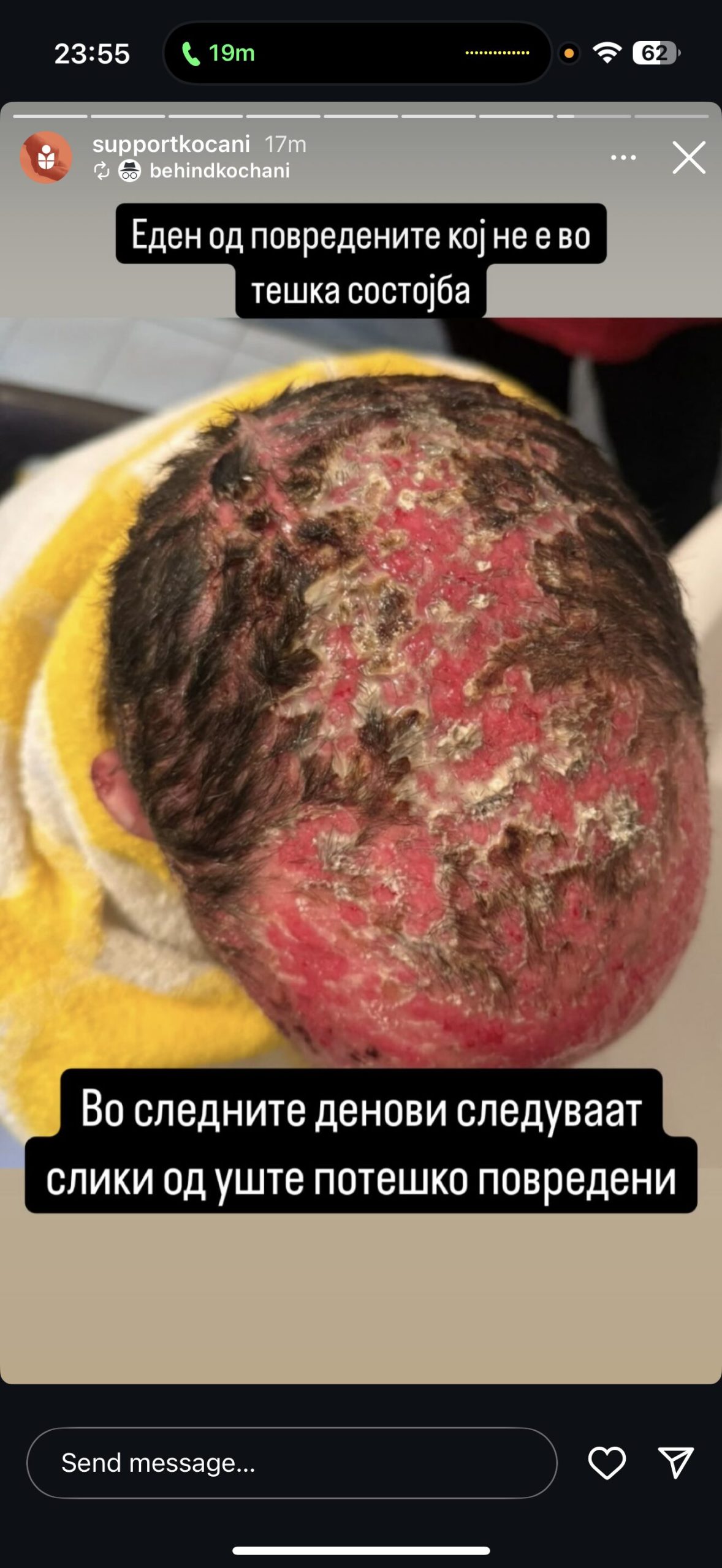 „Во следните денови редовно ќе споделуваме сведоштва од повредените и нивните најблиски. Фотографии од раните. Доколку не можете да гледате експлицитна содржина, можете да го отследите профилот, бидеќи за жал, ова е реалноста во Кочани“.