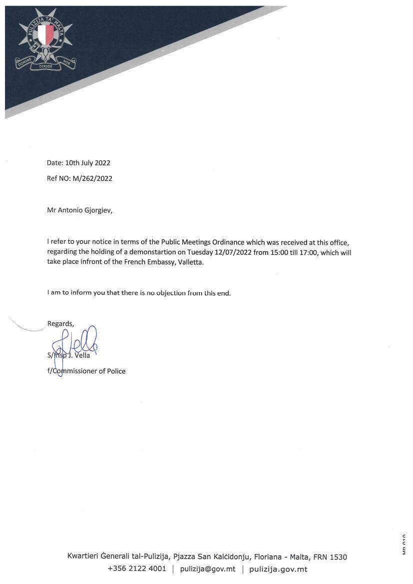 ,,Официјално добивме потврда од Комесарот на полицијата на Малта за одржување на нашиот МИРЕН протест на 12.07.2022 од 15:00 до 17:00 пред Француската амбасада во Валета. Нашиот протест е регистриран и официјализиран, но морам да напоменам затоа што гледам дека има многу од оние што сакаат да дојдат на овој протест и применат на било каков начин агресија! ОД МЕНЕ ИЛИ ОД БИЛО КОЈ НА НАШИОТ ПРОТЕСТ НЕМА ДА БИДЕ ПОДДРЖАНА ИЛИ ДОЗВОЛЕНА АГРЕСИЈА ОД БИЛО КАКОВ ВИД, овде сме достоинствено да ја претставиме Македонија и Македонскиот народ и ќе ги замолам сите што ќе дојдат со мене да ме поддржат.