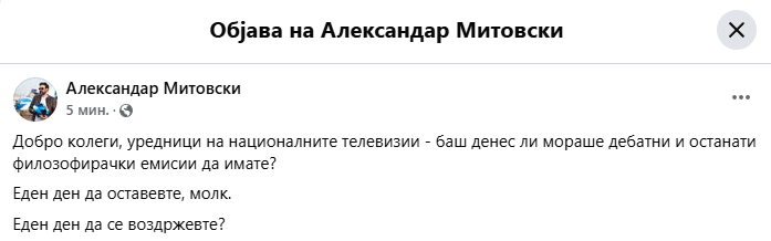 Добро колеги, уредници на националните телевизии – баш денес ли мораше дебатни и останати филозофирачки емисии да имате?