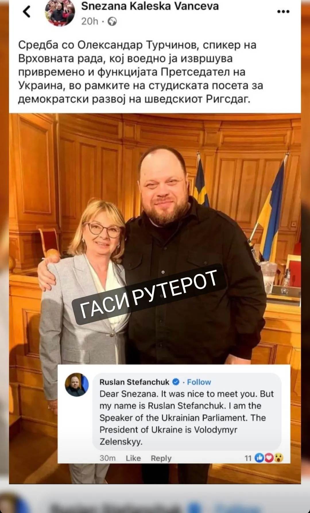 „Драга Снежана, драго ми е што се запознавме, но моето име е Руслан Стефанчук, јас сум спикер на украинскиот парламент, а претседател на Украина е Володимир Зеленски“ – ѝ напиша Стефанчук на пратеничката од Македонија.