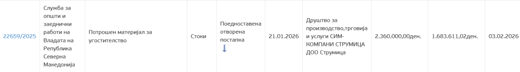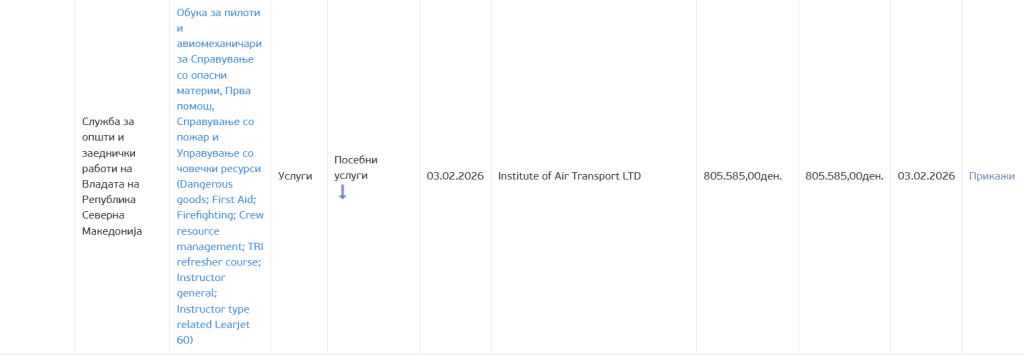 На веб страницата за јавни набавки, Службата за општи и заеднички работи на Владата има објавено два договори за различни јавни набавки. Едниот договор СОЗР го склучува за обука на пилоти во вредност од 805.000 денари или околу 13.000 евра. Вториот договор е за потрошни материјали за угостителство, во вредност од 1.683.611 денари или 27,6 илјади евра.