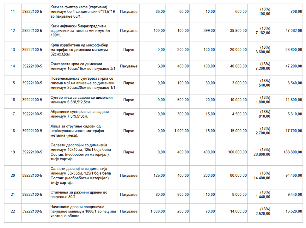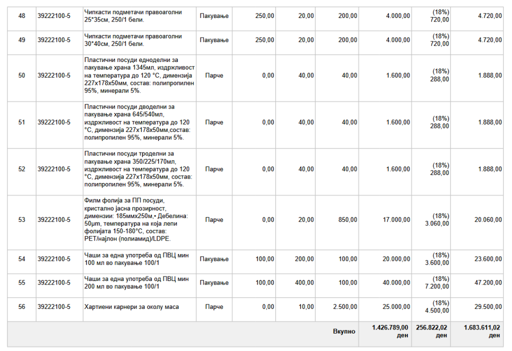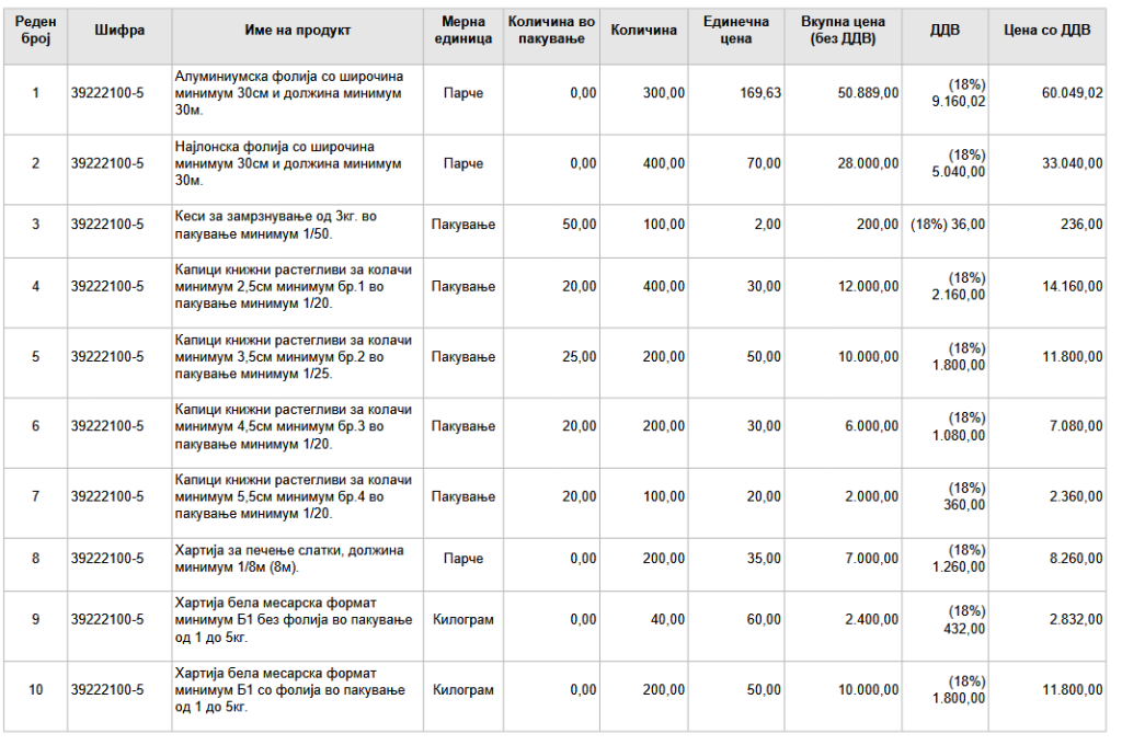 Во вториот договор се набавуваат алуминиумска фолија, пластични кеси, најлонска фолија, пластични садови и слично. Што точно се набавува погледнете во продолжение.