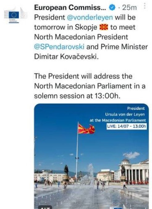 Фон дел Лајен во 13 часот ќе има обраќање во „северномакедонскиот парламент“, стои во твитот објавен од Европската комисија.