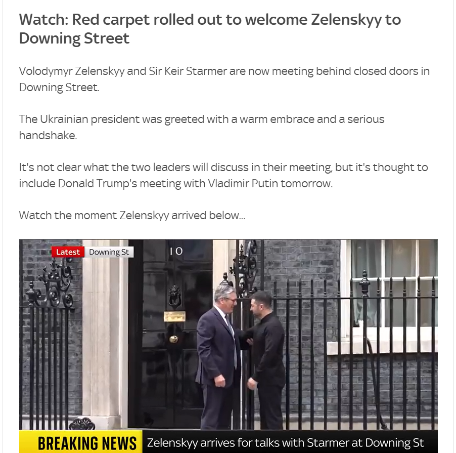 Украинскиот претседател Володимир Зеленски пристигна на Даунинг стрит, каде што беше пречекан од британскиот премиер Кир Стармер, објави Скај њуз.