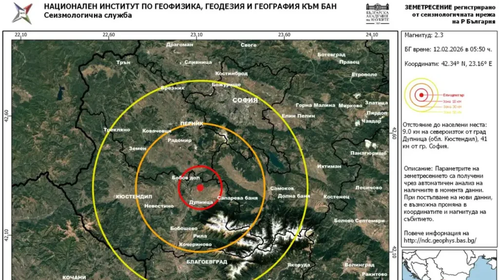 Земјотрес со магнитуда од 2,3 степени според Рихтеровата скала беше регистриран во Бугарија рано наутро во четврток. Епицентарот на земјотресот е помеѓу селата Тополница и Червен Брег во Дупница. Земјотресот се случил во 5:50 часот наутро, според податоците од Националниот институт за геофизика и сеизмологија при Бугарската академија на науките.