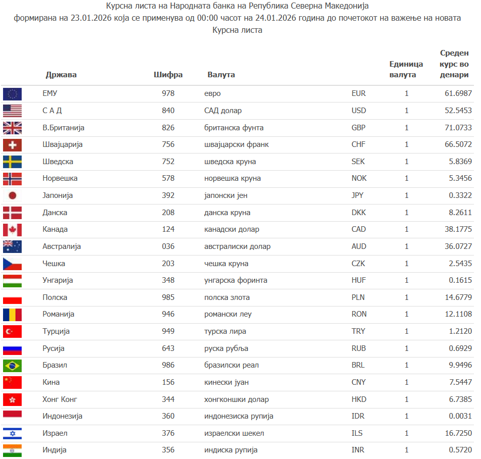 Според курсната листа на Народната банка средниот курс на еврото денеска изнесува 61.6987 денари, а на американскиот долар 52.5453 денари. Средниот курс на британската фунта изнесува 71.0733 денари.