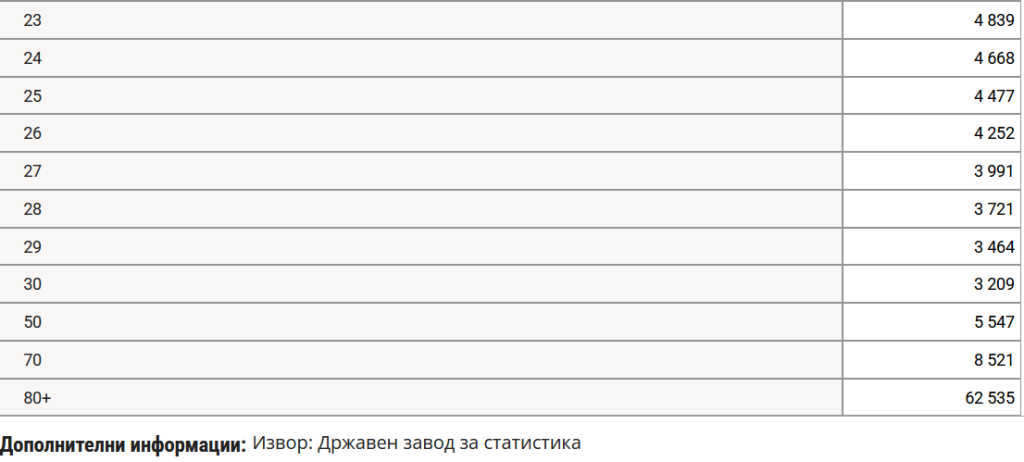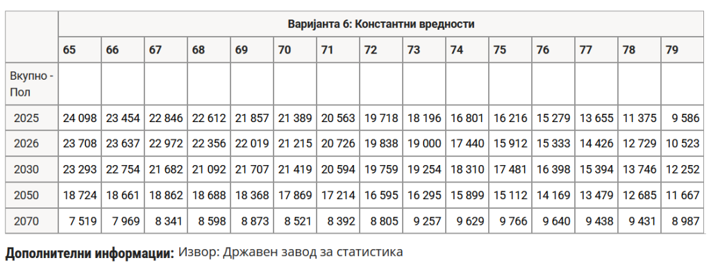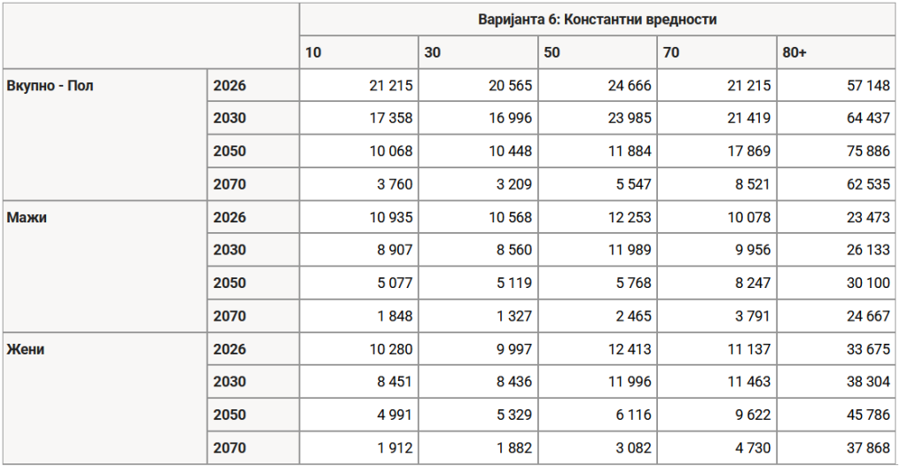 Табелата која ја гледате погоре се податоци на Државниот завод за статистика. Согласно проекциите, од 21.215 деца на возраст од 10 години во 2026 година, бројот ќе се намали на 3760 деца во 2070 година. Бројот на десетгодишни деца се намалува за речиси седум пати. Слични се и податоците за лица на 30 години, каде во 2026 година бројот изнесува 20.565, додека во 2070 година ќе изнесува 3209 лица. Бројот на лица над 80 години варира, од 57.000 до 75.000 како максимум во вкупната проекција.