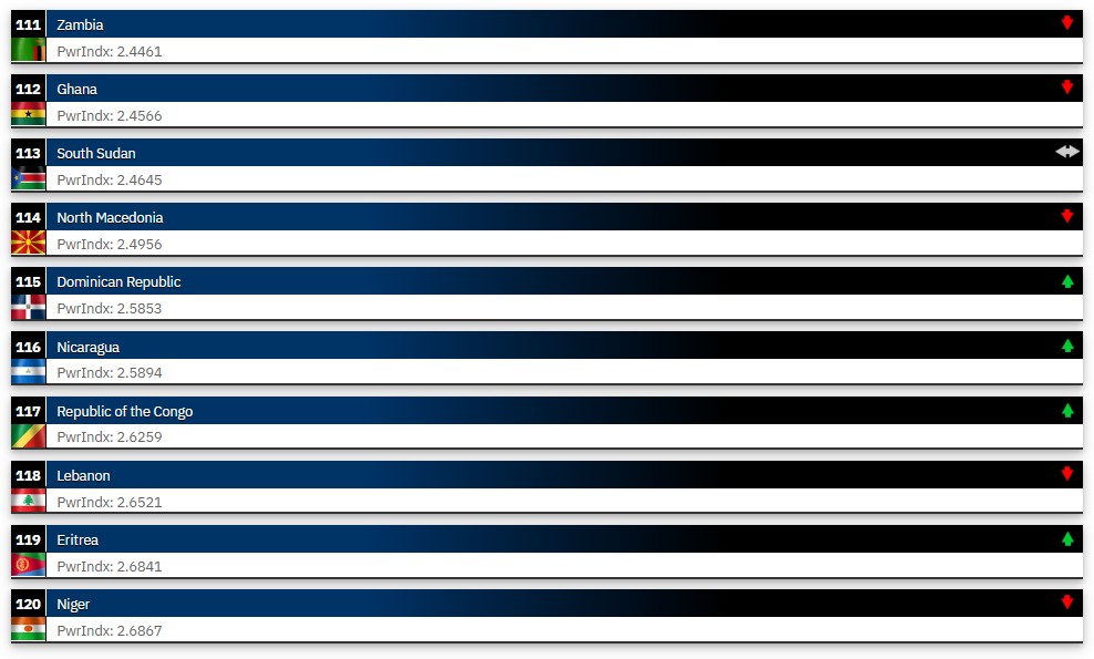 Армијата на Македонија се најде на 114 место од 145 земји според моќноста. Со ова, бележи пад од две места во однос на 2025 година, кога нашата армија беше на 112 место. Според листата на Global Firepower, македонската армија е во друштво на Гана, Јужен Судан, Доминиканската Република, Никарагва и Република Конго.