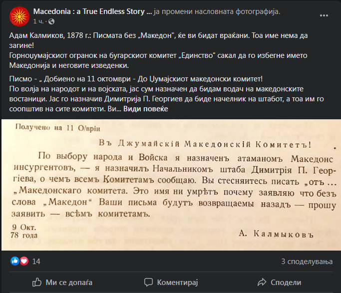 Адам Калмиков, 1878 г.: Писмата без „Македон”, ќе ви бидат враќани. Тоа име нема да загине!
