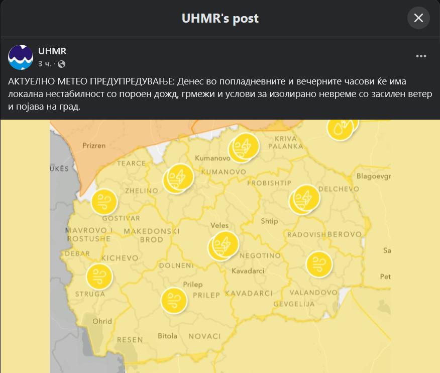 Управата за хидрометеоролошки работи (УХМР) издаде актуелно метео предупредување за денеска.