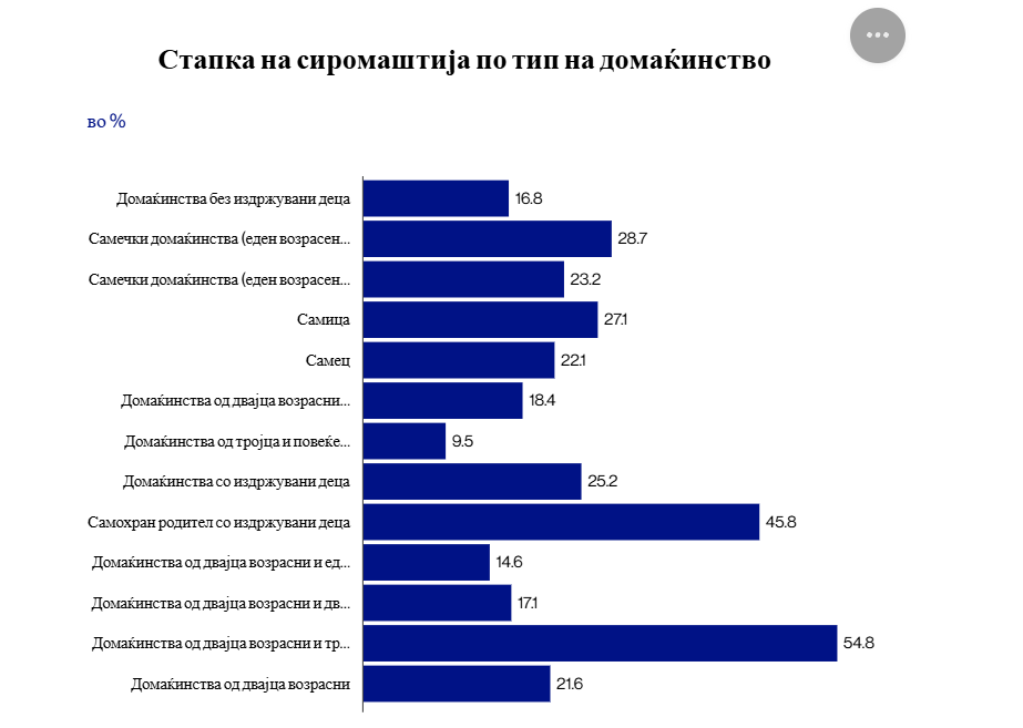 Анализирано по типови домаќинства, стапката на сиромаштија на домаќинствата составени од двајца возрасни со две издржувани деца во 2024 година е 17.1 отсто.