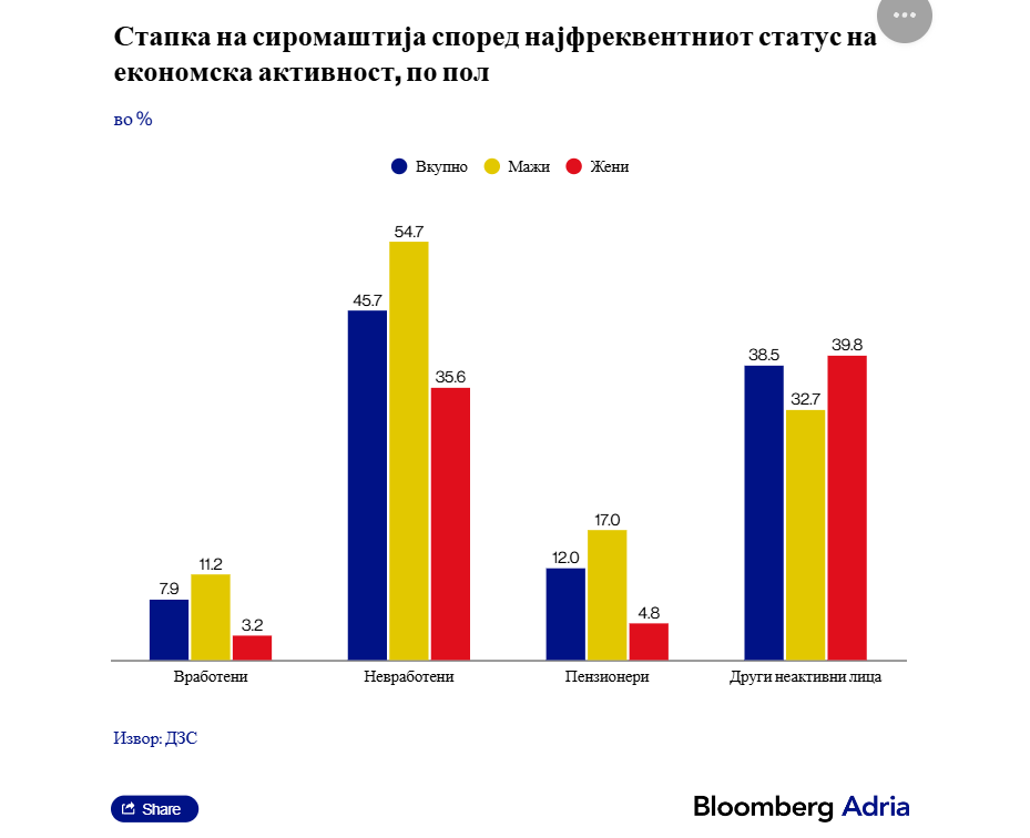 Според најфреквентниот статус на економската активност, стапката на сиромашни вработени лица е 7.9 отсто, додека стапката на сиромашни пензионери е 12.0 отсто.