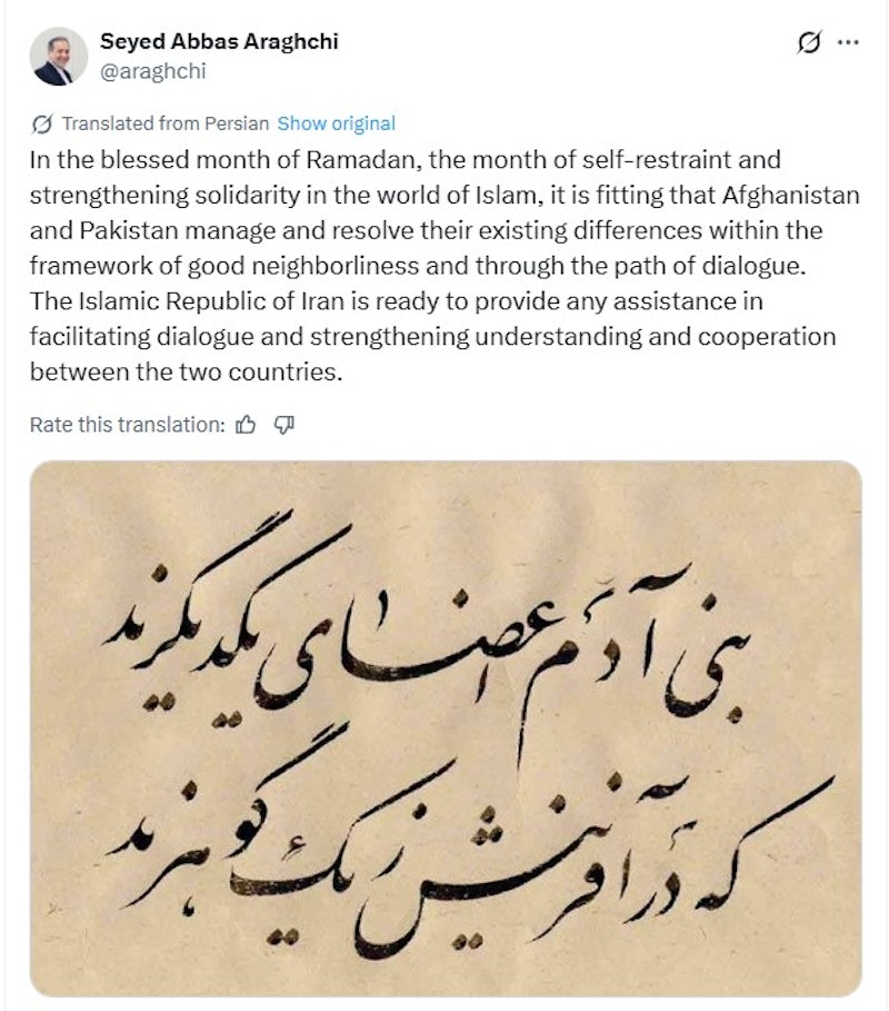 Иран понуди да помогне во „олеснувањето на дијалогот“ за решавање на конфликтот меѓу Авганистан и Пакистан откако Исламабад објави „отворена војна“ против владата на Талибанците и изврши воздушни напади врз Кабул по граничните судири. „Исламската Република Иран е подготвена да обезбеди секаква потребна помош за олеснување на дијалогот и за подобрување на разбирањето и соработката меѓу двете земји“, изјави иранскиот министер за надворешни работи, Абас Арагчи, во објава на X.
