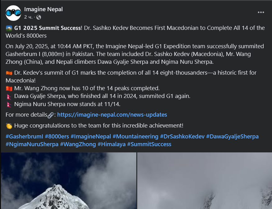 „Со ова успешно искачување, д-р Кедев го означува завршувањето на сите 14 осумилјадници – историски прв за Македонија!“ се наведува во објавата на експедицијата.