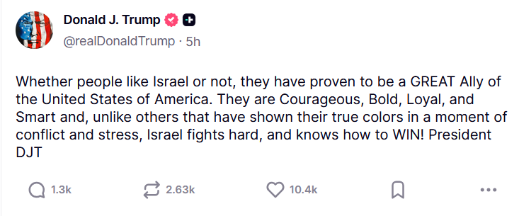Израел се докажа како „ОДЛИЧЕН сојузник“ на Соединетите Американски Држави, изјавува американскиот претседател Доналд Трамп во објава на неговата платформа Truth Social.