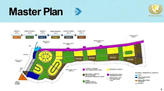 Слајд со текст „Главен план“ прикажува четири фази од трансформацијата што се движи од Рафа преку Кан Јунис до градот Газа. Блоковите кодирани во ѓолта боја се означени како „станбени области“, а како „крајбрежен туризам“ 180 кули, означени со светло розова боја. Големи делови од земјиштето се наменети за „центри за податоци од индустрискиот комплекс“ и напредно производство. Регионите се пресечени со зелени делови означени со „паркови, земјоделство и спортски објекти“.