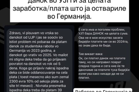 Повеќе студенти кои биле на студентска работа во Германија преку „Work&Travel“ програмата се соочуваат со известувања од Управата за јавни приходи да поднесат електронска даночна пријава (Е-ПДД) и да ги пријават своит приходи од остварената сума која веќе им е оданочена во Германија, а притоа и да платат данок за поврат на задржаниот данок кој го добиле од Германија, а бил трансфериран на македонска девизна сметка пренесува студентска организација „Студентарија МК“.