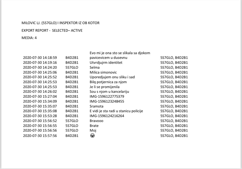 Порталот објави и пораки што наводно се и доказ во случајот и кои еден од инспекторите му ги испратил на претходно споменатиот Љуба Миловиќ. „Шоу со неа во канцеларија“, „Е види ја што прави во полициска станица“, пишува во пораките во кои наводно полицајците се фалат со „жешката акција“ во станицата.