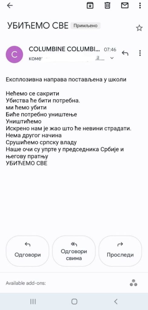 „Нема да се криеме. Ќе треба убиства, ќе убиваме. Ќе биде потребно уништување. Ќе уништиме. Искрено ни е жал што ќе настрадаат невините. Друго решение нема, ќе ја урнеме српската влада. Нашите очи се вперени кон претседателот на Србија и неговата придружба. Ќе ги убиеме сите“, стои во заканувачката порака.