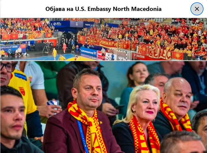 Амбасадата на „Фејсбук“ му посака среќа на македонски тим предводен од селекторот Кирил Лазаров и ја објави фотографијата од амбасадорката, придружена од претседателот на Ракометната федерација, Живко Мукаетов.