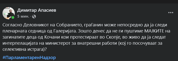 – Согласно Деловникот на Собранието, граѓанин може непосредно да ја следи пленарната седница од Галеријата. Зошто денес да не ги пуштиме МАЈКИТЕ на загинатите деца од Кочани кои протестираат во Скопје, во живо да ја следат интерпелацијата на министерот за внатрешни работи (кој го посочуваат за селективна истрага)? – стои во објавата на Фејсбук.