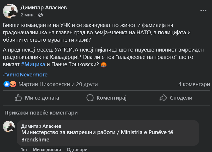 Апасиев го тагна МВР: Бивши командант на УЧК ѝ се заканува на градоначалничка на главен град и МУВА НЕ ВЕ ЛАЗИ?!
