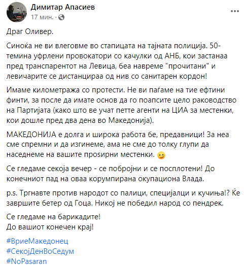Апасиев: Драг Оливер, синоќа не ви влеговме во стапицата на тајната полиција, имаме километража со протести