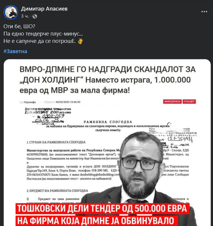 За оваа компанија, ДПМНЕ на пресови обвинуваше дека поради блискоста со поранешниот градоначалник на Ѓорче Петров од СДС, „Дон Холдинг” добива тендери од Оливер Спасовски и повикуваше обвинителството да отвори постапка. Наместо МВР под Панче Тошковски да ги истражи скандалозно доделените тендери од СДС на оваа компанија, сега сведочиме дека неговото министерство повторно ги склучува истите сомнителни тендери со „Дон Холдинг”.