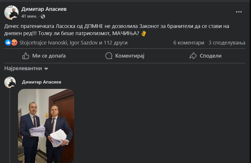 – Денес пратеничката Ласоска од ДПМНЕ не дозволила Законот за бранители да се стави на дневен ред!!! Толку ли беше патриотизмот, МАЧИЊА? – напиша Апасиев.