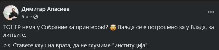 Апасиев: Ставете клуч на врата, да не глумиме “институција” – Тонер нема за принтерот во Собрание, ваљда се е за лигњите у Влада потрошено