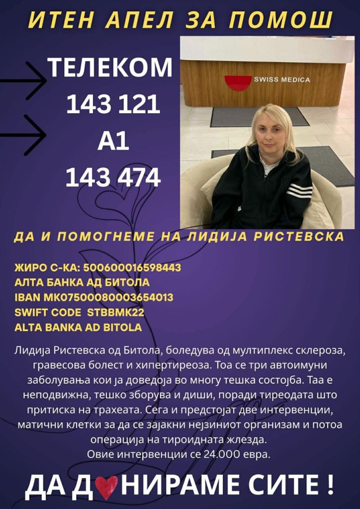 Почитувани читатели, Ве замолуваме доколку сте во можност да помогнеме на Лидија која има потреба од лекување во странство. Сите податоци се во продолжение.