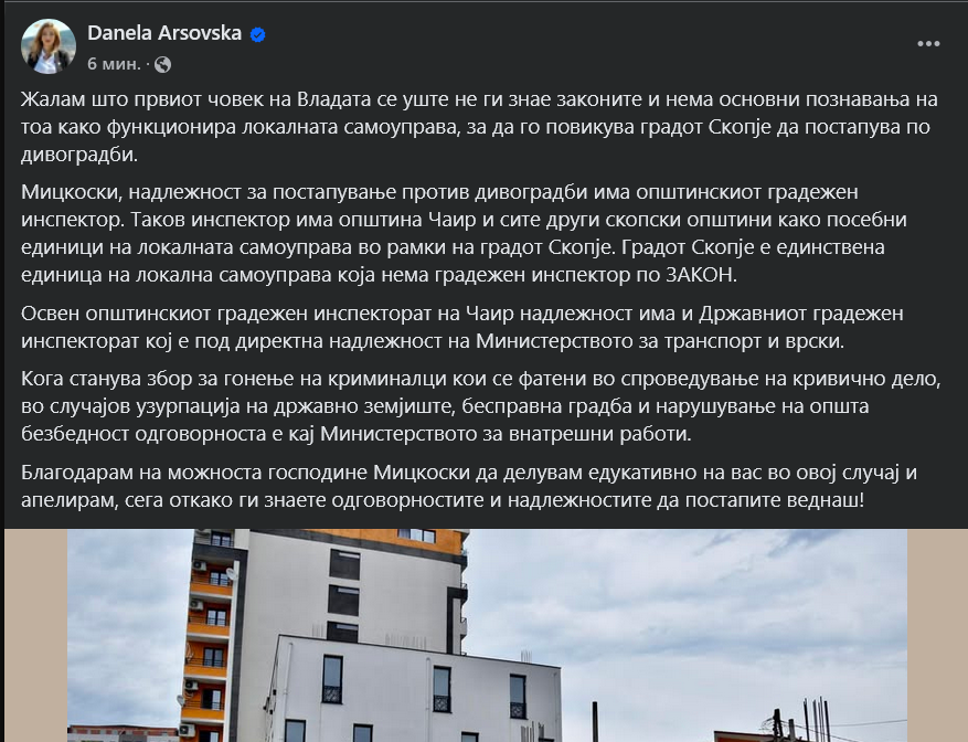 Жалам што првиот човек на Владата се уште не ги знае законите и нема основни познавања на тоа како функционира локалната самоуправа, за да го повикува градот Скопје да постапува по дивоградби, објави на Фејсбук градоначалничката на Град Скопје, Данела Арсовска.