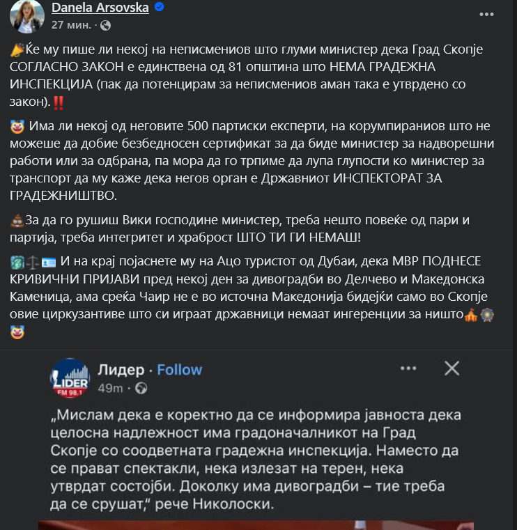Ќе му пише ли некој на неписмениов што глуми министер дека Град Скопје СОГЛАСНО ЗАКОН е единствена од 81 општина што НЕМА ГРАДЕЖНА ИНСПЕКЦИЈА (пак да потенцирам за неписмениов аман така е утврдено со закон). – пишува на Фејсбук градоначалничката на Град Скопје, Данела Арсовска откако министерот за транспорт Александар Николоски на пратеничко прашање одговори дека Град Скопје има инспекција и треба да постапи за дивоградбите во Чаир.