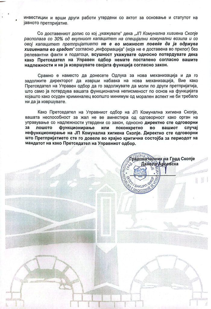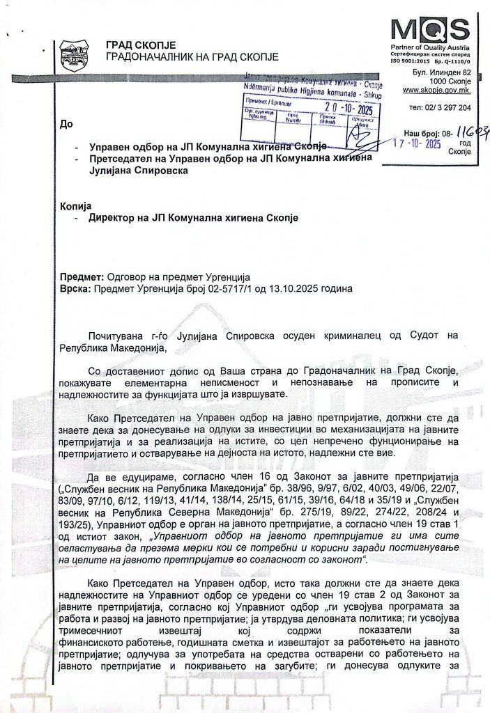 За ѓубрето низ Скопје е одговорна ТВОЈАТА криминална структура во Комунална хигиена на чело со Јулијана Спировска која е претседател на Управниот одбор (земи читај допис ако имаш време меѓу заканите и правење бизнис)