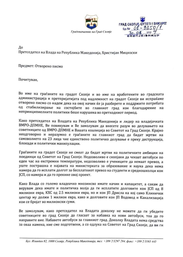 Градоначалничката на Град Скопје, Данела Арсовска, му пиша отворено писмо на премиерот Христијан Мицкоски откако советниците на ВМРО-ДПМНЕ повторно не гласаа за набавка на нови автобуси во Скопје.