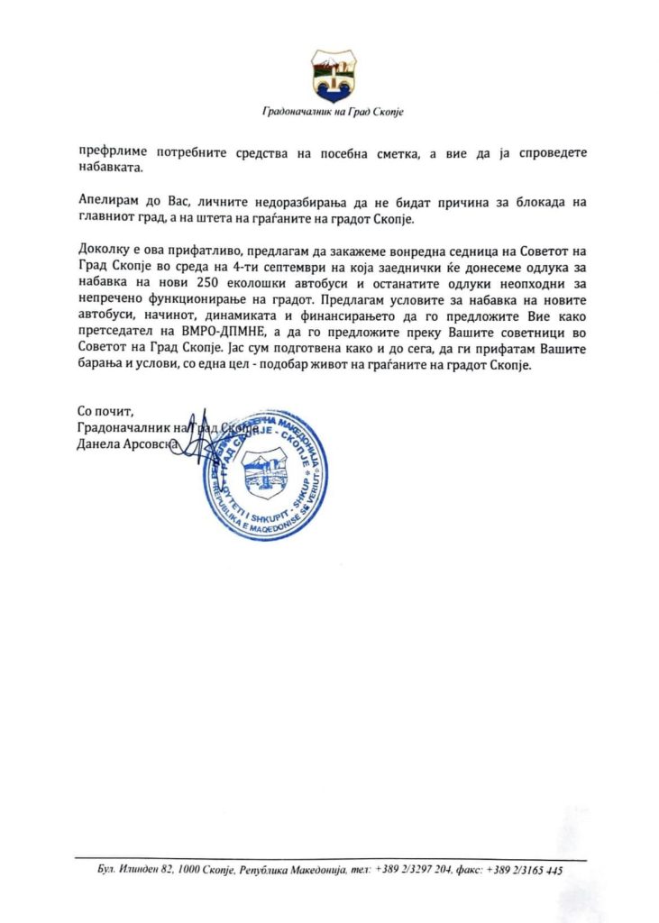 Доколку е ова прифатливо, предлагам да закажеме вонредна седница на Советот на Град Скопје во среда на 4-ти септември на која заеднички ќе донесеме одлука за набавка на нови 250 еколошки автобуси и останатите одлуки неопходни за непречено функционирање на градот. Предлагам условите за набавка на новите автобуси, начинот, динамиката и финансирањето да го предложите Вие како претседател на ВМРО-ДПМНЕ, а да го предложите преку Вашите советници во Советот на Град Скопје. Јас сум подготвена како и до сега, да ги прифатам Вашите барања и услови, со една цел – подобар живот на граѓаните на градот Скопје.