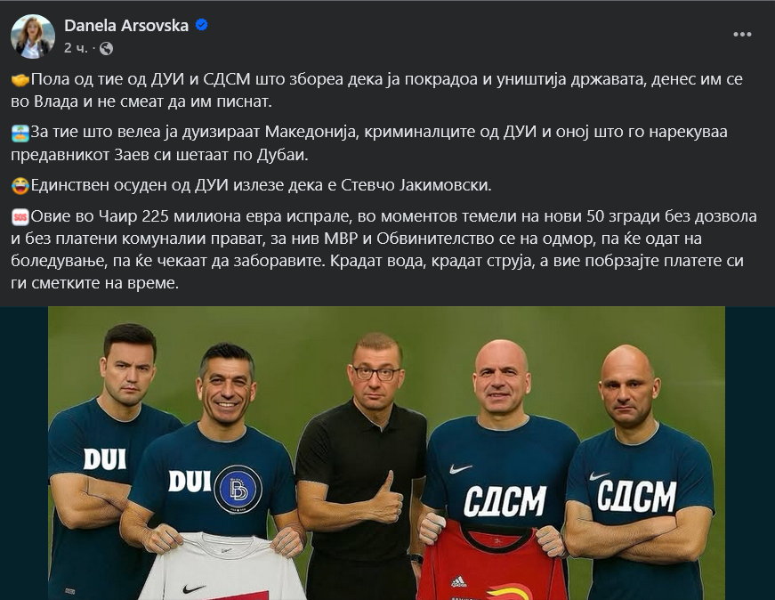 Пола од тие од ДУИ и СДСМ што збореа дека ја покрадоа и уништија државата, денес им се во Влада и не смеат да им писнат, пишува на Фејсбук градоначалничката на Град Скопје, Данела Арсовска.