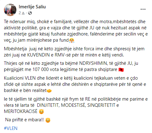 Ајде сите заедно да внесеме НОВ дух во политиката со принципи и високи вредности на ДОСТОИНСТВО, СКРОМНОСТ, ИСКРЕНОСТ и ЗАСРЕДНОСТ“, напиша таа на фејсбук, само на албански јазик.