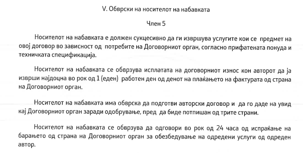 Во договорот пишува дека провизијата за завршената работа е 0.01% и дека обрвска на агенцијата е да изготвува авторски договори, во рок од 24 часа од испраќање на барањето од страна на Државниот орган, при што некој во државниот орган повторно ќе мора да го прегледа, провери и одобри истиот договор што за тоа време би можел самиот да го состави.