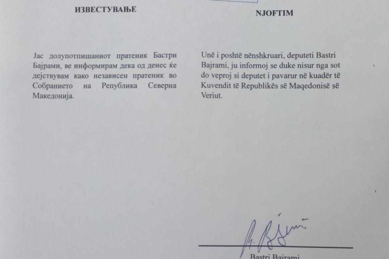– Јас долупотпишаниот пратеник Бастри Бајрами, Ве информирам дека од денес ке дејствувам како независен пратеник во Собранието на Република Македонија. – се вели во соопштението испратено до Талат Џафери.