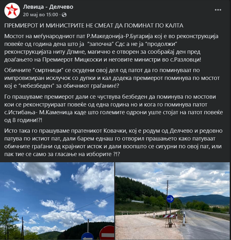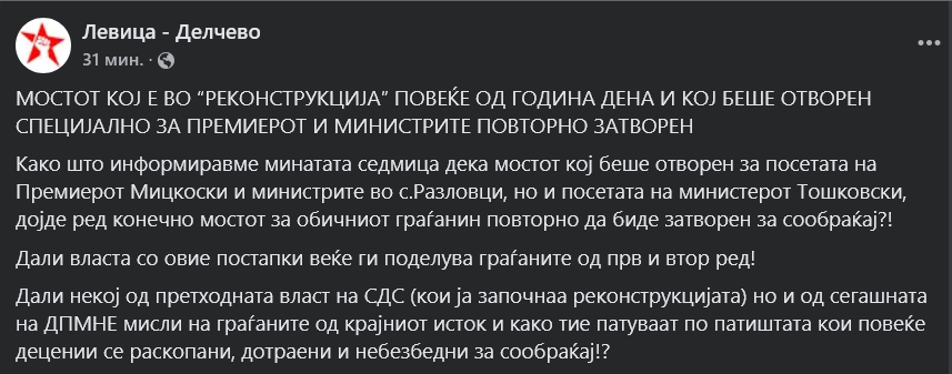 Мостот на влез во Делчево, кој е во „реконструкција“ повеќе од година дена, беше специјално отворен за Мицкоски и Тошковски да не возат по кал и дупки, па денеска е повторно затворен, реагираат од локалниот огранок на Левица во Делчево.