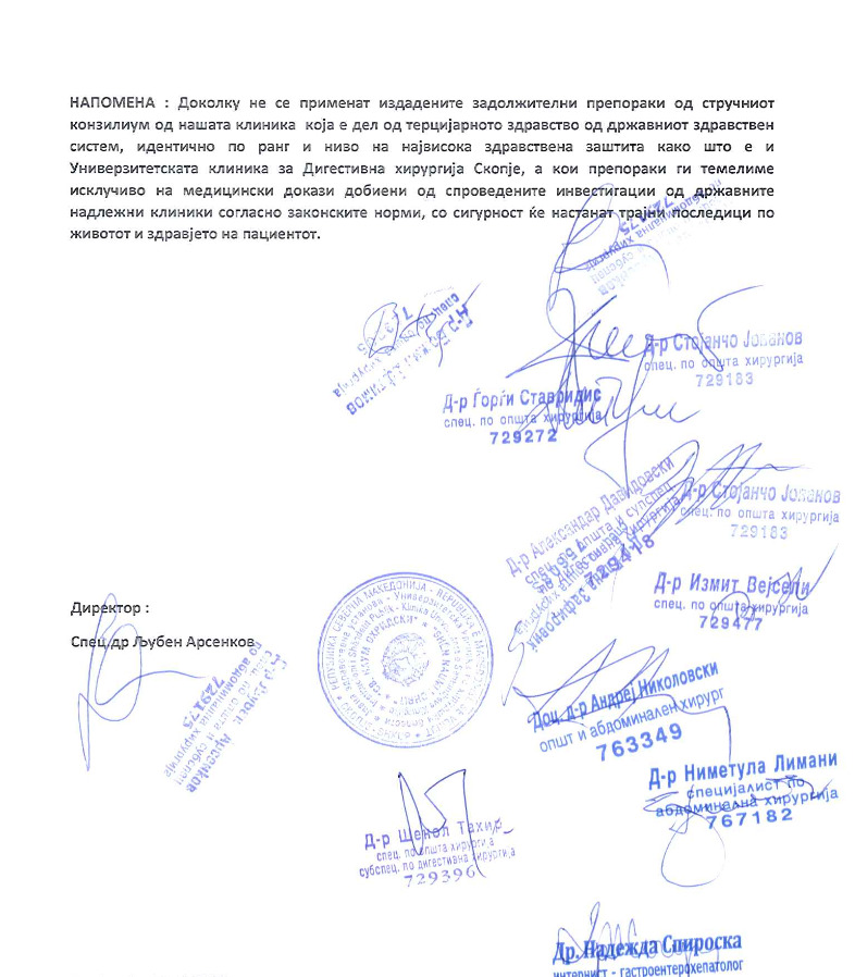 Последната страница од едно од конзилијарните мислења дадени од доктори од градската болница во Скопје