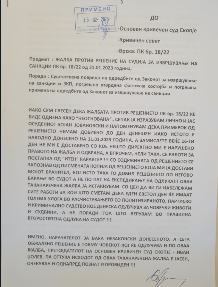Осудениот до јавноста ја достави и жалбата која ја има поднесено до Кривичен суд.