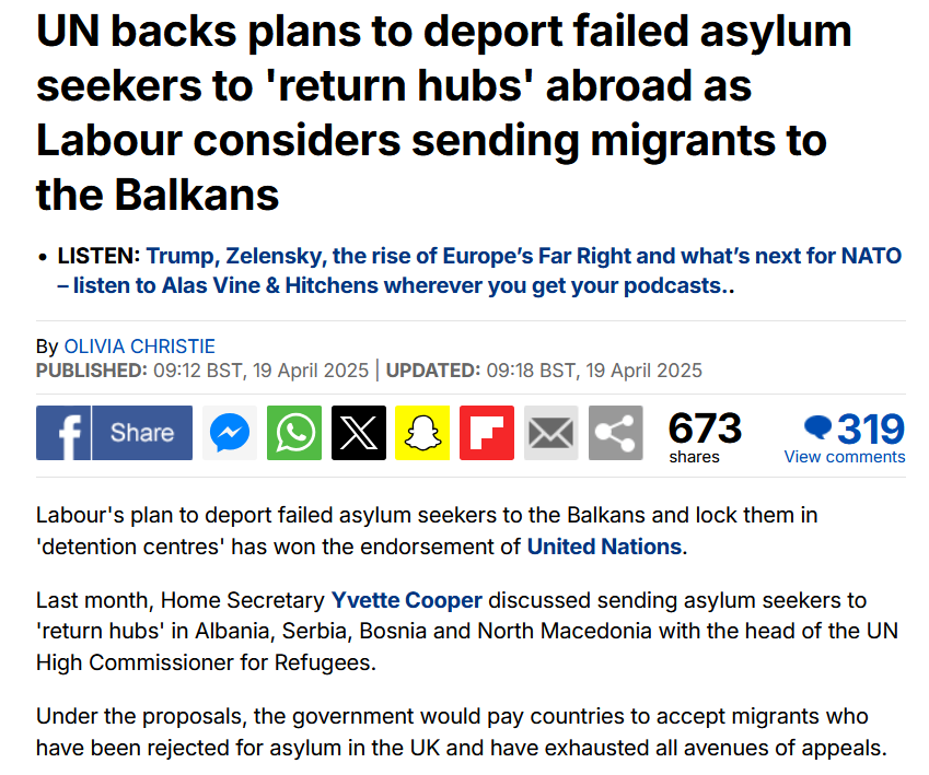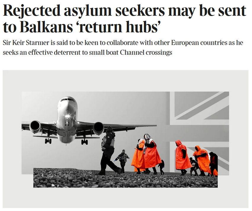 Одбиените баратели на азил може да бидат испратени во балканските „return hubs“ е наслов на британски „Тајмс“ од 21 март 2025 година.
