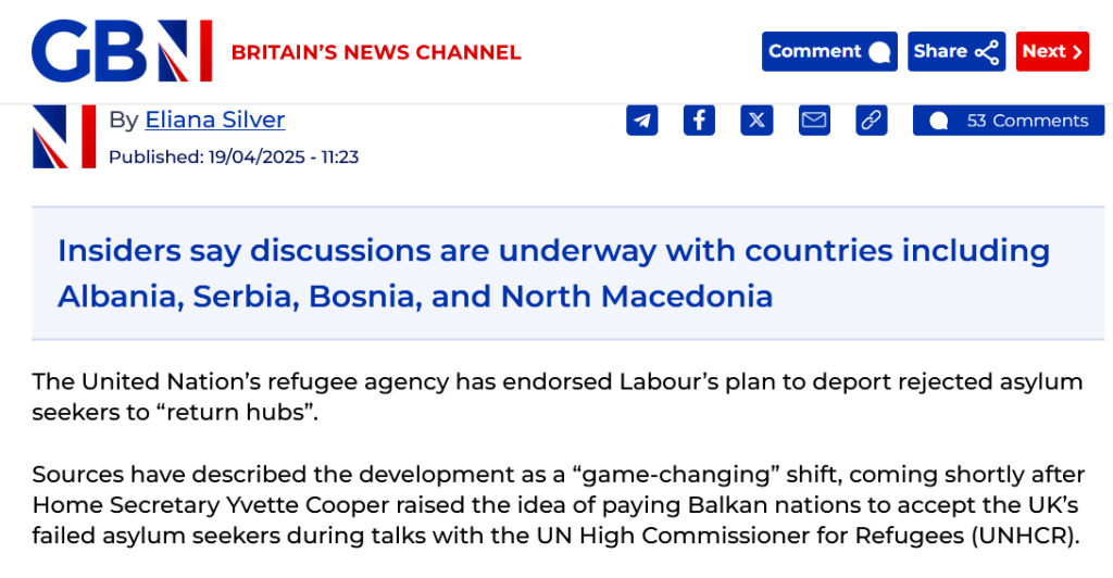 „Владата подготвува предлози за отворање серија „return hubs“ во странство каде што мигрантите би биле испраќани откако ќе им биде одбиено барањето за азил и ќе ги исцрпат сите можности за жалба. Министрите сè уште не започнале формални разговори, но владини извори изјавија дека планираат да се обратат до земјите од Западен Балкан, вклучувајќи ги Албанија, Србија, Босна и Северна Македонија.“ пишува Тајмс.