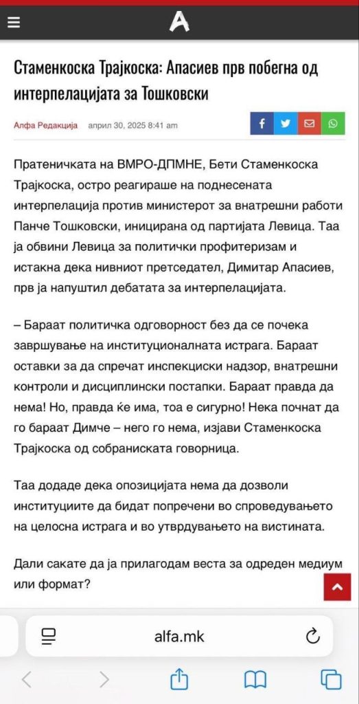 Дали сакате да ја прилагодам веста за одреден медиум или формат? Оваа реченица беше забележана во вест на ТВ Алфа, прашање кое го поставува Chat GPT доколку му побарате определена помош.