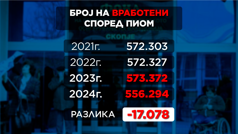 Но, ваквиот сооднос е резултат на тоа што лани бројот на официјално вработените лица со платени придонеси се намалил за над 17 илјади, во споредба со 2023 година. Од документот на ПИОМ може да се види и дека ова е најголемо намалување на бројот на вработени со платени придонеси во последните 15 години.
